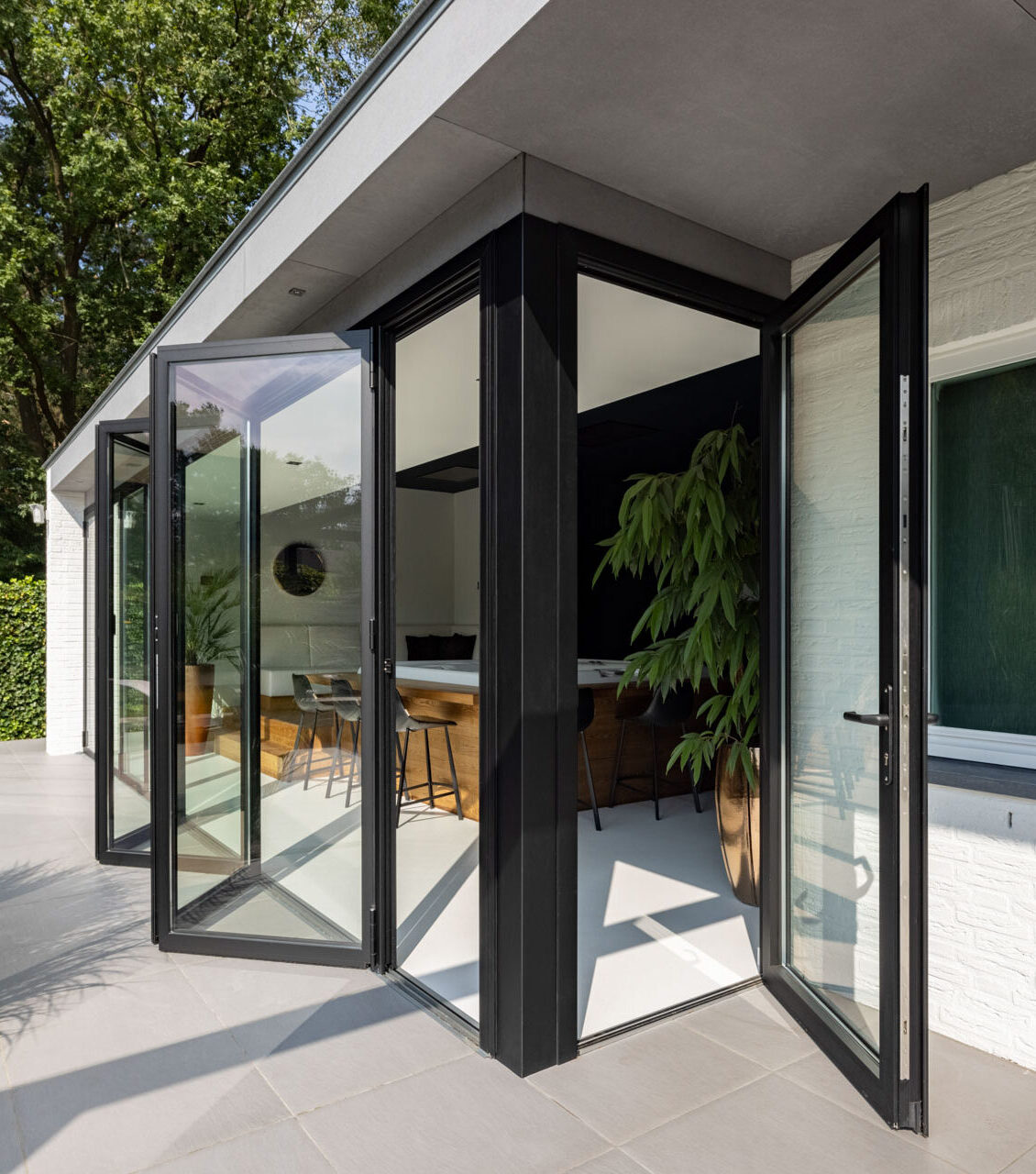 Vouwdeuren bieden gebruikers veel vrijheid. De volledige opening haalt buiten naar binnen en binnen naar buiten. Een terras en/of tuin wordt bij de woning betrokken. Geniet volledig van het “outdoor living” concept. Vouwdeuren vormen een perfecte, brede toegang van huis naar terras of een verbinding van café of restaurant met de buitenruimte die tijdens het seizoen wordt gebruikt. Het systeem MB-FOLDLINE HD is een bijzonder comfortabele oplossing voor dagelijks gebruik. Het maakt constructies van grote afmetingen mogelijk. Vouwdeuren kunnen zowel naar buiten als naar binnen geopend worden en de vleugel configuratie kan op willekeurige wijze worden vormgegeven. Het is een modern product dat is ontworpen om te voldoen aan de hoge eisen van zowel de architect als de bewoner.